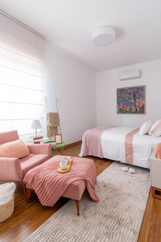 No dormitório projetado pela arquiteta Cinthia Claro, reina a tranquilidade não apenas pelo aconchego do ambiente, como pela colocação do tapete