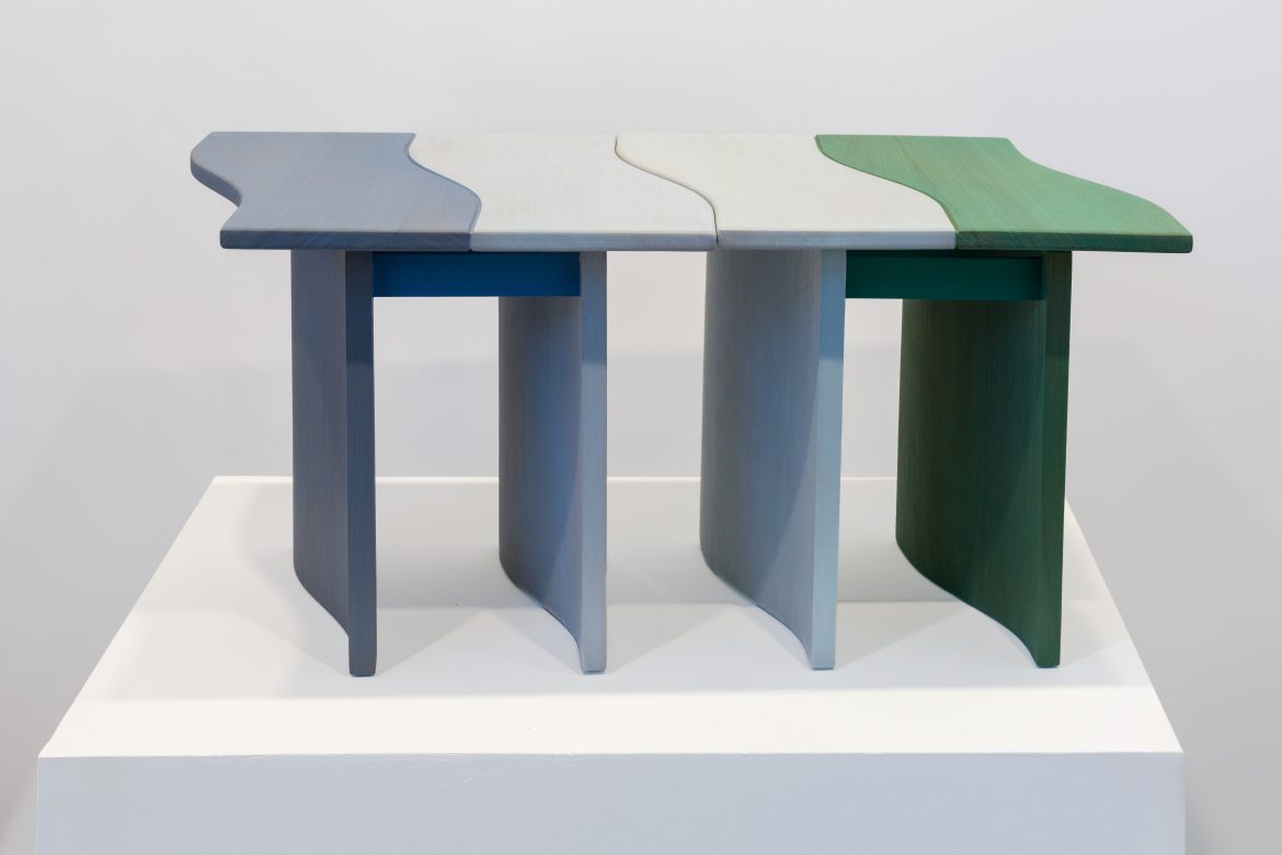 Se no primeiro momento a madeira natural era a protagonista, agora entra em cena a madeira tingida, revelando uma nova camada sensorial da coleção. O tingimento foi pensado para manter os veios visíveis – uma escolha consciente que remete à transparência da água: um azul profundo onde ainda se pode ver o fundo. As espécies escolhidas, como o jequitibá, têm veios que permanecem visíveis mesmo após o tingimento, permitindo que a natureza do material siga em evidência, ainda que sob novas cores. Os tons predominantes são os azuis e verdes – matizes que habitam o cotidiano do designer e se conectam com sua paisagem pessoal em Fortaleza. Não são escolhas ditadas por tendências, mas por afeto e permanência.