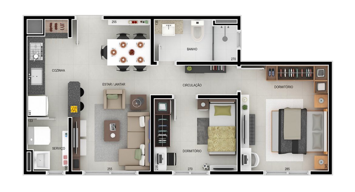 Essa é uma parte de grande interesse do cliente, afinal, mostra de que forma seu imóvel será visto pelas pessoas. Por isso, não esqueça dos detalhes na representação dos revestimentos, portas, janelas, gradis e telhados.
