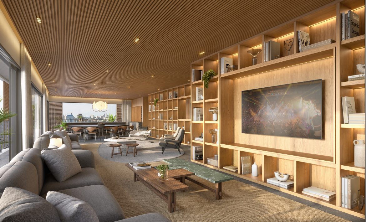 Nas áreas comuns, como o lobby, foyer, salão de festas, academia, café, espaço coworking, studio de yoga e funcional, além do mirante e piscina com vista panorâmica, o tropicalismo está presente no mobiliário, com peças exclusivas, que vão além do catálogo. “Pensamos em como os moradores irão utilizar os espaços, em seu uso real, e como será a convivência entre eles para a escolha de cada detalhe no projeto”, comenta Greg Bousquet, fundador do Architects Office.
