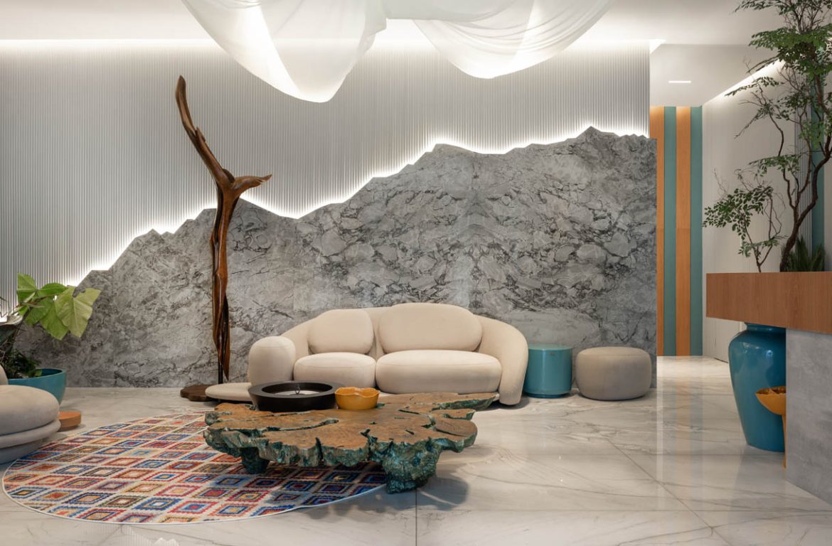 De um lugar de afeto e conexão nasce o Loft Kaá. Assinado pelo casal de arquitetos, o nome do ambiente traz a atmosfera da natureza em um espaço de 62 m². O projeto propõe um mergulho na biomimética, trazendo laços fortes com pedras naturais exóticas. Estrela do ambiente, a Patagônia Scarlet é uma pedra composta por cristais rosa. Outros elementos como a madeira e o couro do peixe pirarucu aplicado na mesa lateral do sofá, trazem significado sensorial ao espaço.