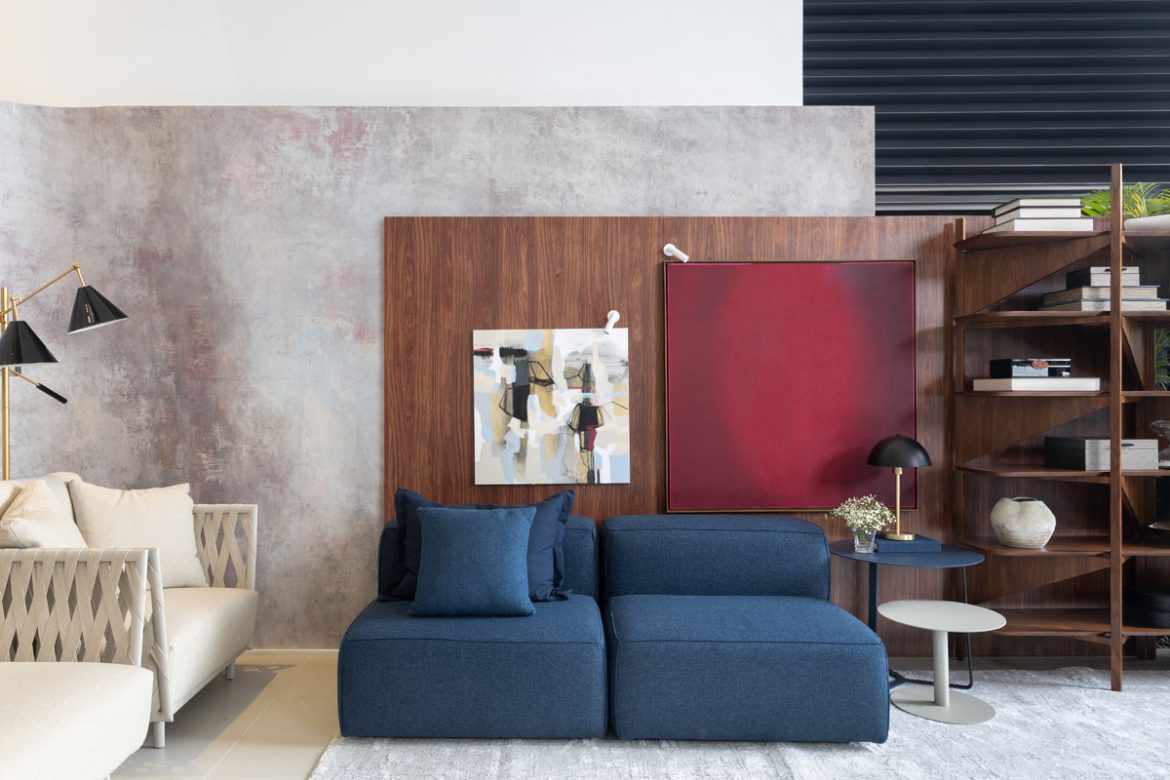 Com apenas 15 dias entre a concepção e a entrega final, o processo exigiu agilidade e foco absoluto no essencial. Madeira natural, azul profundo, bordô e tons neutros compõem a paleta escolhida, reforçando o clima de acolhimento e sobriedade. Obras de arte pontuam a composição como pausas visuais, enquanto tecidos e acabamentos texturizados ampliam a sensação de aconchego.