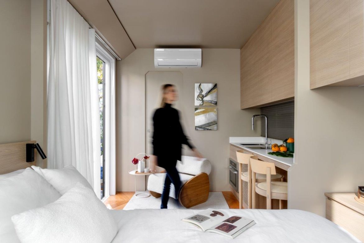 A proposta materializa um novo jeito de morar, mais funcional e sustentável, que reflete o desejo por uma vida simples, conectada à natureza e com mais significado. Compacta, mas com alma grande, a tiny house é uma solução de moradia inteligente que valoriza o conforto em poucos metros e apresenta um modelo replicável para diferentes contextos. O layout otimiza a planta integrada, composta por sala, cozinha e quarto em um único ambiente, com banheiro fechado.