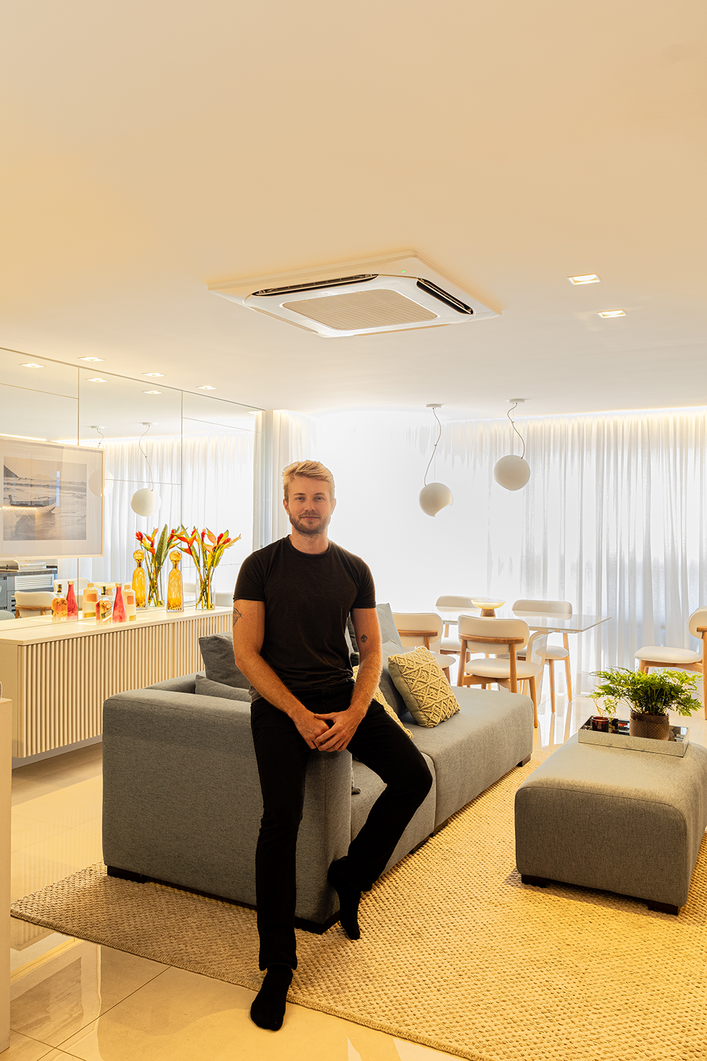 O layout reforça essa lógica, o sofá no centro do espaço, atua como elemento organizador da circulação, conectando estar, jantar e área gourmet. Já o mobiliário segue uma linha discreta, com peças leves e proporcionais ao espaço, evitando interferências visuais e mantendo a leitura contínua dos ambientes integrados. A base neutra da decoração permite que os materiais assumam protagonismo. Madeira, superfícies refletivas e tecidos claros constroem uma atmosfera equilibrada, enquanto obras de arte pontuam o ambiente com mais personalidade.