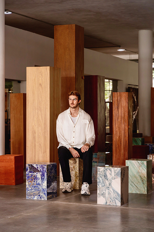 Foto: Everson Martins | Projeto: Leonardo Zanatta | Com a instalação “Tectônicas em Exílio”, o arquiteto gaúcho transforma o espaço de entrada em uma grande galeria imersiva, onde terra, rochas e madeiras amazônicas desenham o skyline simbólico de uma cidade construída a partir de matérias-primas nacionais.