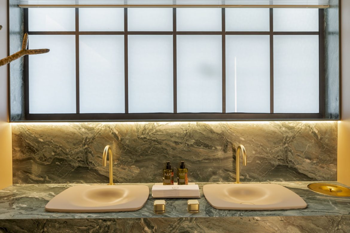 Na bancada, dois lavatórios repousam sobre uma superfície escultural: a nova resina da Fórmica, modelo Paladina Green, é uma prévia inédita da coleção Matizes, destinada para áreas molhadas e que também foi aplicada para revestir o banco. O projeto luminotécnico é percebido através das luzes indiretas e cênicas, com fitas de LED, que alternam a dimerização para entregar atmosferas envolventes.