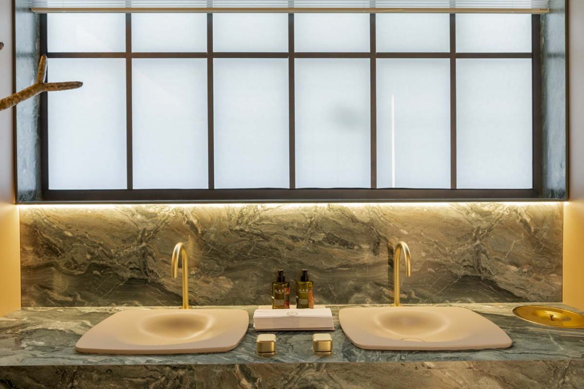 Na bancada, dois lavatórios repousam sobre uma superfície escultural: a nova