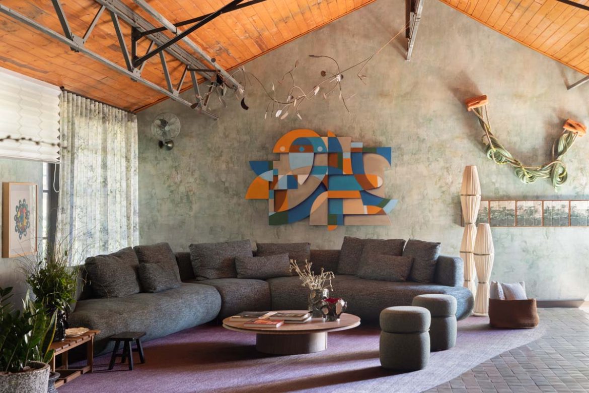 Atendendo como fundo para o sofá, a obra é do artista visual e grafiteiro Marcelo Eco. O papel de parede oportunizou o protagonismo das cores e a percepção de 3D, brincando com cores e a ilusão de ótica