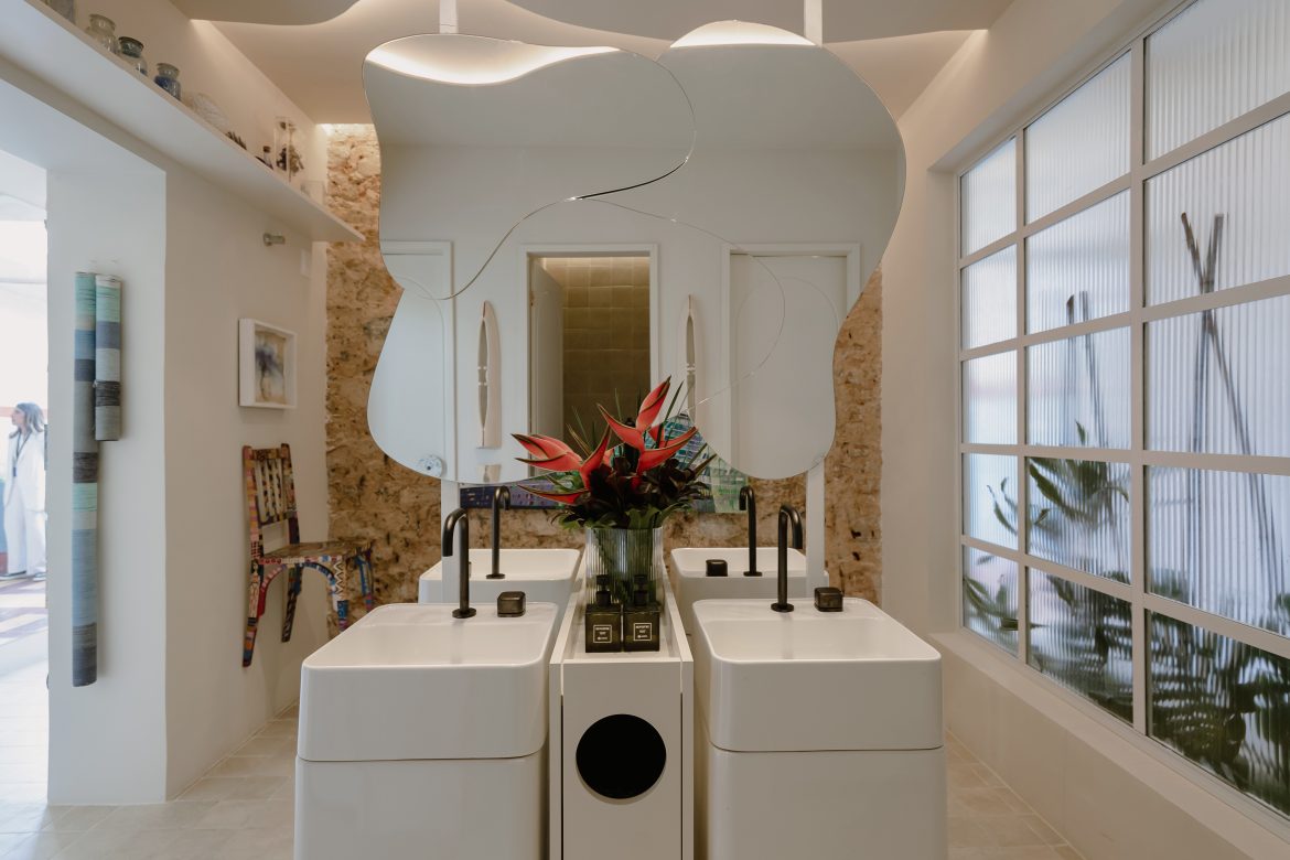 Já no Lavabo Terra e Sal projetado por Andressa Matos, o espelho VIVIX Spelia Incolor foi aplicado em duas peças sobrepostas com formas orgânicas, remetendo ao movimento das ondas do mar. A solução se alinha ao conceito do ambiente, que propõe uma conexão simbólica entre o sertão e o mar por meio das formas. “Foi a melhor opção dentre os produtos para poder explorar”, explica a arquiteta. “O principal diferencial está no cuidado técnico, respeito às normas de segurança e na vasta opção de vidros para soluções diversas.