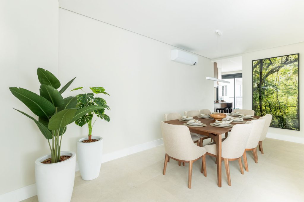 Na sala de jantar, o arranjo do amadeirado claro da mesa evidencia a continuidade da proposta que marca todo o imóvel. “Junto com o espelho, que faceia uma das paredes, a iluminação externa mais uma vez foi primordial para nosso objetivo de acrescer amplitude sem a necessidade de grandes intervenções”, explana a arquiteta.