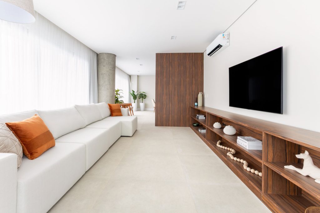 Desde a entrada, o revestimento em pau-ferro se estendeu para a sala de estar e deu forma ao amplo rack aberto formado por nichos generosos. Instalada diretamente na parede, a arquiteta Natália Souza conta que a proposta para a TV foi fazê-la ‘flutuar’ sobre o móvel, ganhando mais destaque no setor