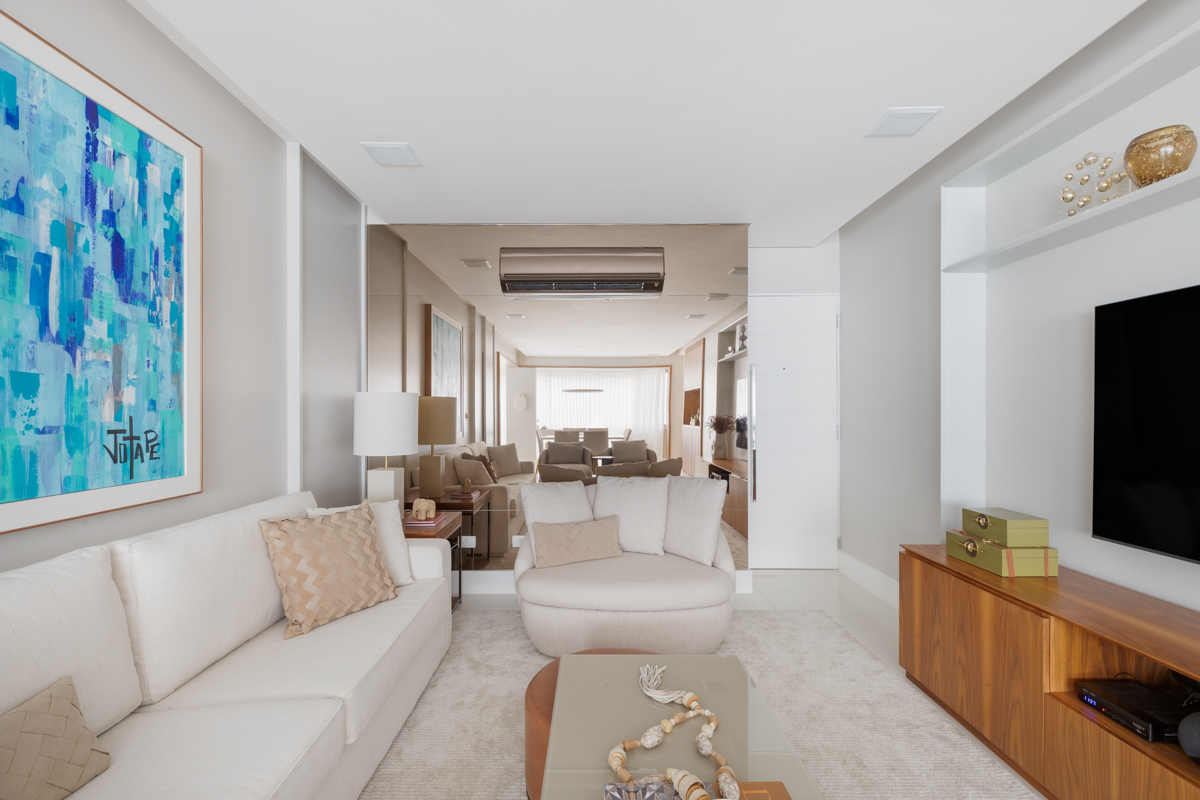 Foto: Julia Novoa | Projeto: Sabrina Salles | Ambientes de estar, home theater e jantar totalmente integrados, com layout otimizado e paleta clara que reforça a amplitude e o aconchego.