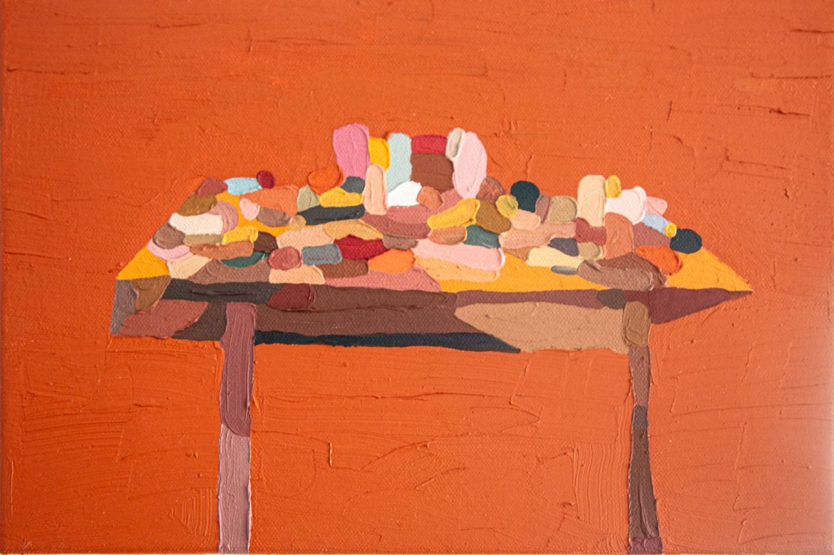A pesquisa de Tathyana Santiago se desenvolve na fronteira entre a abstração e a figuração do corpo feminino, criando composições marcadas por gestualidade espontânea e texturas densas. Suas obras evocam o ambiente doméstico e íntimo das casas sergipanas, incorporando cadeiras e mesas como símbolos de acolhimento e memória.
